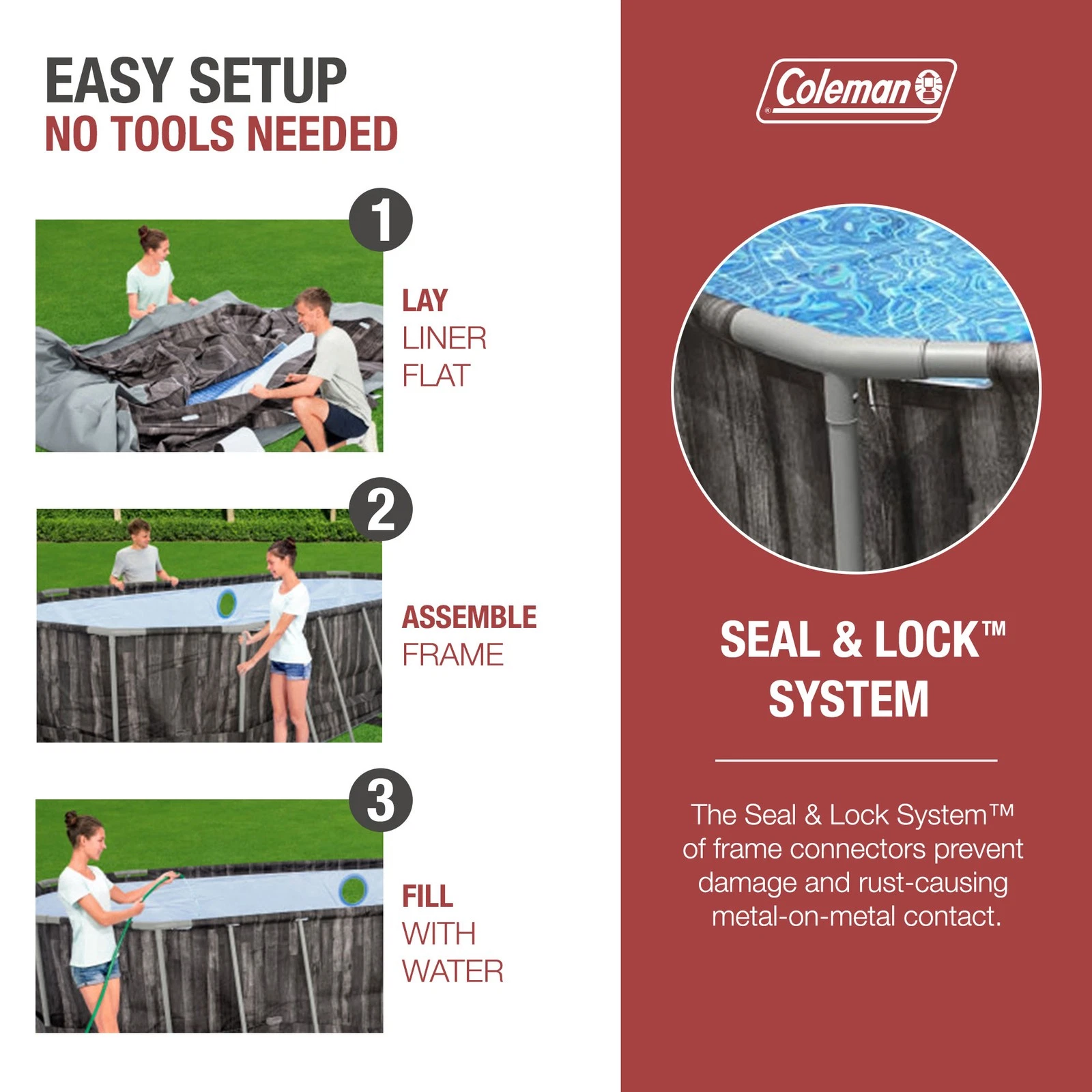 The pool can be assembled without specialized tools using the frame’s simple connection system.