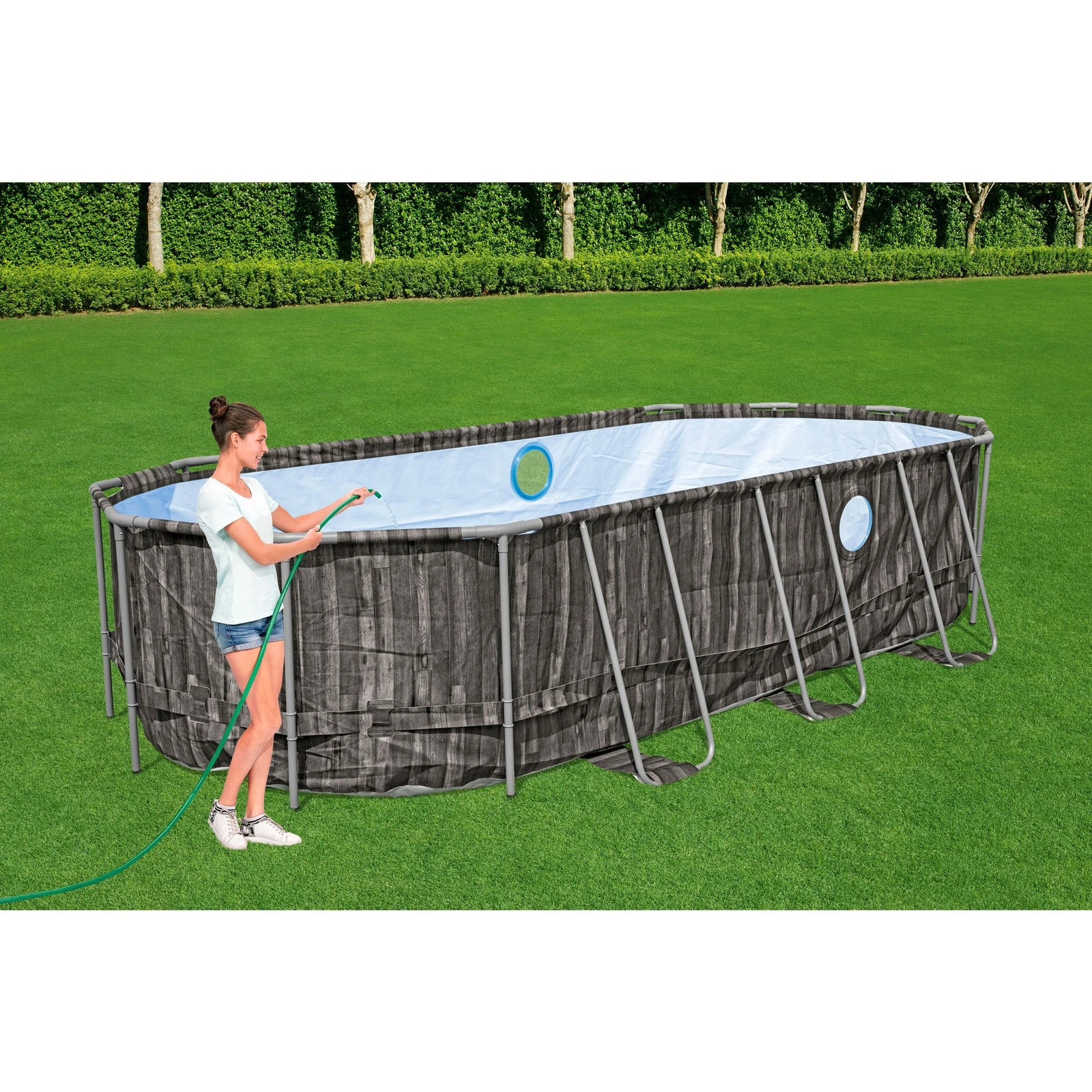 The viewing windows add an interactive feature rarely found in standard above-ground pools.